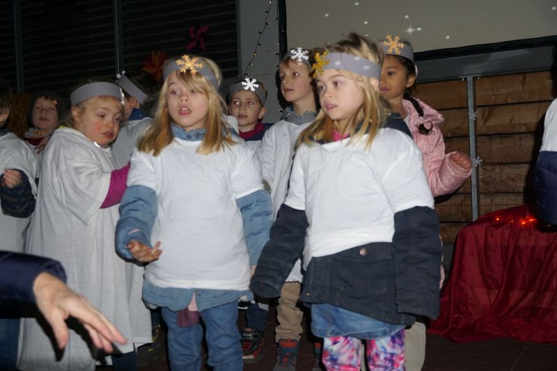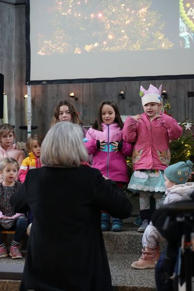 Die Kinder aller Gruppen haben weihnachtliche Lieder vorgetragen und die Gäste konnten hierbei auf einer großen Leinwand passende Fotos betrachten, die die Kinder im Alltag der Vorweihnachtszeit zeigten. Nach der Feier in der Kirche ging es dann noch weiter im Kindergarten und im Spatzenhaus, wo die Eltern beim Adventskaffee in den einzelnen Gruppen noch einmal Gelegenheit zum Austausch hatten. Ganz zum Ende der Feier wurde in der Halle noch einmal mit musikalischer Begleitung gemeinsam getanzt und Weihnachtslieder gesungen.