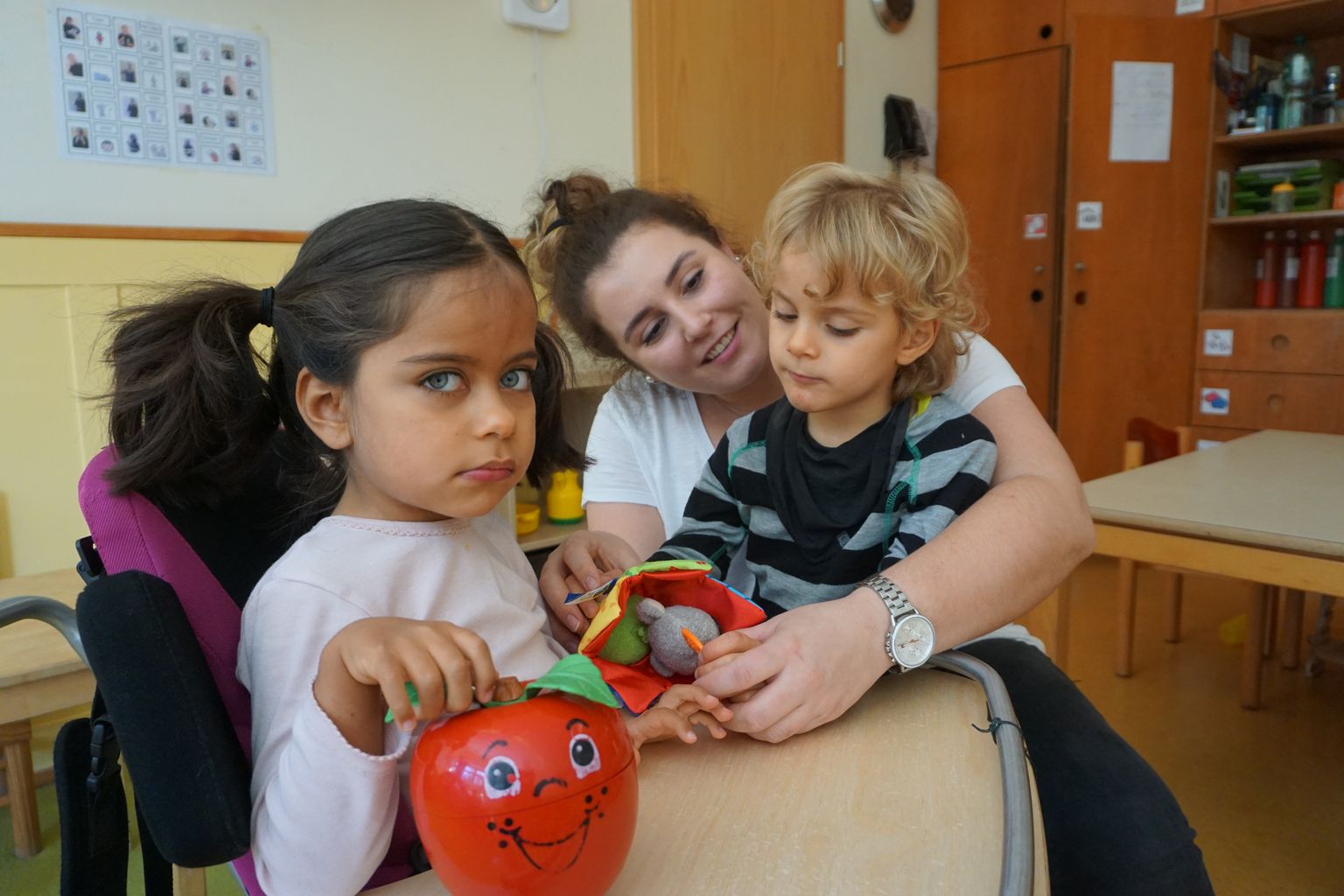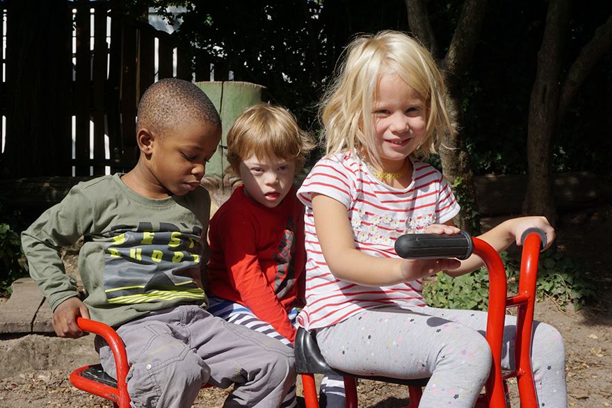 Für die Kinder bietet nicht nur die Breite der Räumlichkeiten und des Spielmaterials, die große Expertise der pädagogischen und therapeutischen Fachkräfte z.B. im Bereich Sprachentwicklung (unterstützte Kommunikation), von der zum Beispiel auch Kinder aus mehrsprachigen Haushalten profitieren, oder das besondere Augenmerk der Mitarbeitenden auf die motorische Entwicklung jedes Kindes viele Vorteile. Vor allem auch das soziale Miteinander der Kinder untereinander ist für alle ein Gewinn. Das Thema Behinderung ist kein Tabuthema und wird ganz offen angesprochen. Dementsprechend selbstverständlich ist es für die Kinder, ohne Blick auf die jeweiligen Fähigkeiten des anderen Kindes Freundschaften zu schließen, bei denen die in der Erwachsenenwelt oft betonten Unterschiede keine Rolle spielen. „Dies vermittelt nicht nur den Kindern mit Sonderförderbedarf, sondern allen unseren Kindern das Gefühl, nicht perfekt sein zu müssen, und auch Kinder ohne Behinderung lernen von klein an, mit ihren eigenen Schwächen konstruktiv und gut umzugehen“, erklärt Valentina Schenk. „Unsere Erfahrung zeigt: Die Kinder verstehen sehr schnell, dass es nicht um Mitleid oder um falsche Rücksichtnahme geht, sondern um Mitfühlen und Geduld füreinander. Es ist selbst nach so vielen Jahren für mich immer wieder toll zu sehen, wie zum Beispiel in unserem großen Morgenkreis auch die Kinder, die sonst vielleicht eher ungeduldig sind, ganz selbstverständlich verstehen, warum bei anderen Kindern manche Dinge vielleicht etwas länger dauern.“