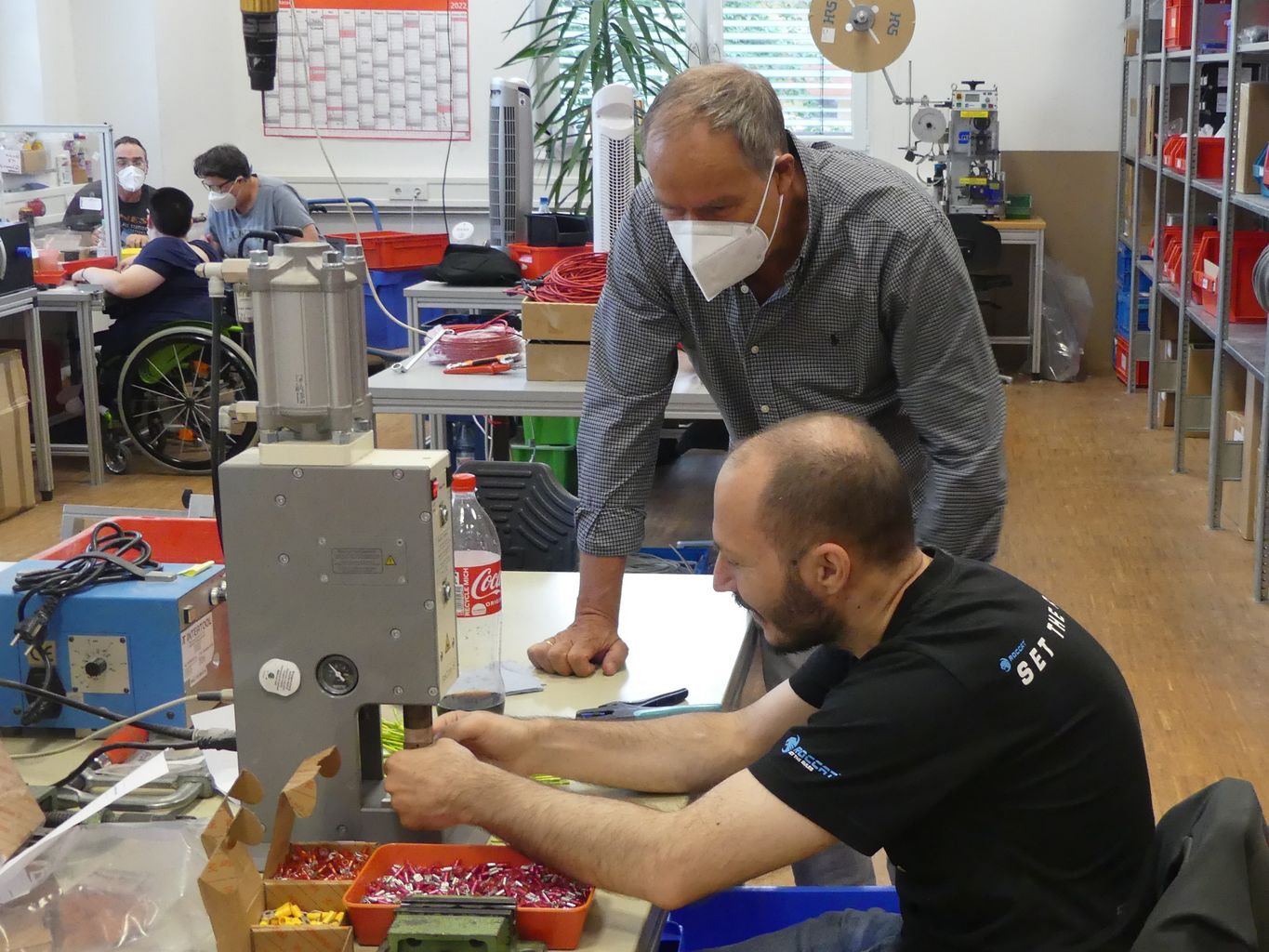 Einen persönlichen Eindruck vom Alltag der Menschen mit Behinderung konnte sich Eckart Würzner im Anschluss an die angeregte Gesprächsrunde bei einem Rundgang durch die Werkstatt machen. In der Metallabteilung lernte er einige der Mitarbeitenden kennen, die für große Firmen in der Region Teile fertigen, und ein Besuch im Förder- und Betreuungsbereiches (FuB) bot Einblicke in die Tagesstruktur von Menschen, die stärker beeinträchtigt sind. Vom Obergeschoss der Werkstatt konnte er zudem einen Blick auf die Zukunft werfen: Auf dem Hospital-Gelände entsteht ein zweistöckiger Neubau, in dem neben dem räumlich erweiterten FuB auch die Offenen Hilfen und die Lebenshilfe-Verwaltung einziehen werden.